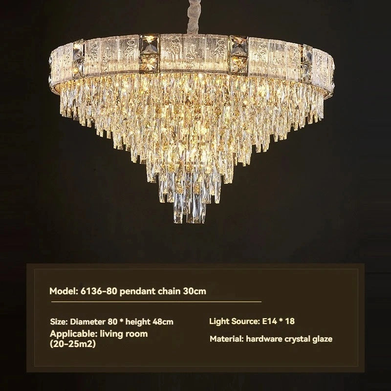 Its chain-mounted design allows adjustable height installation, making it suitable for dining rooms, living areas, bedrooms, kitchens, restaurants, and hotel environments. With energy-saving light technology and crystal detailing, this chandelier balances aesthetic appeal with functional lighting performance.